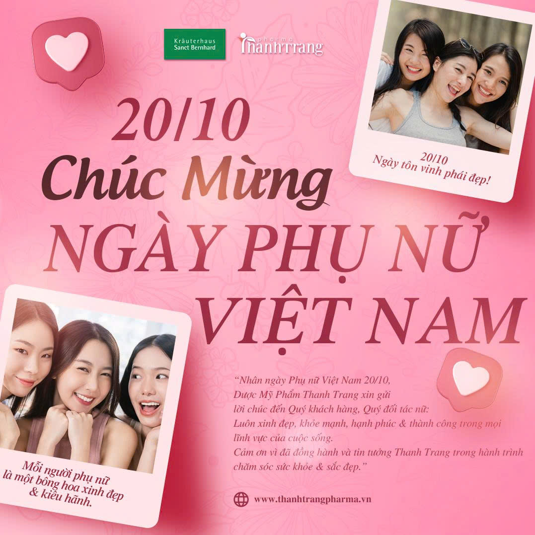 Chúc mừng Ngày Phụ nữ Việt Nam 20/10 cùng Thanh Trang Pharma là dịp đặc biệt để gửi trọn tình yêu thương, lời chúc tốt đẹp và sự tri ân sâu sắc đến một nửa thế giới. Kính chúc toàn thể phái đẹp luôn hạnh phúc, khỏe mạnh và thành công. Hãy cùng Thanh Trang Pharma lan tỏa yêu thương và tôn vinh vẻ đẹp phụ nữ Việt!