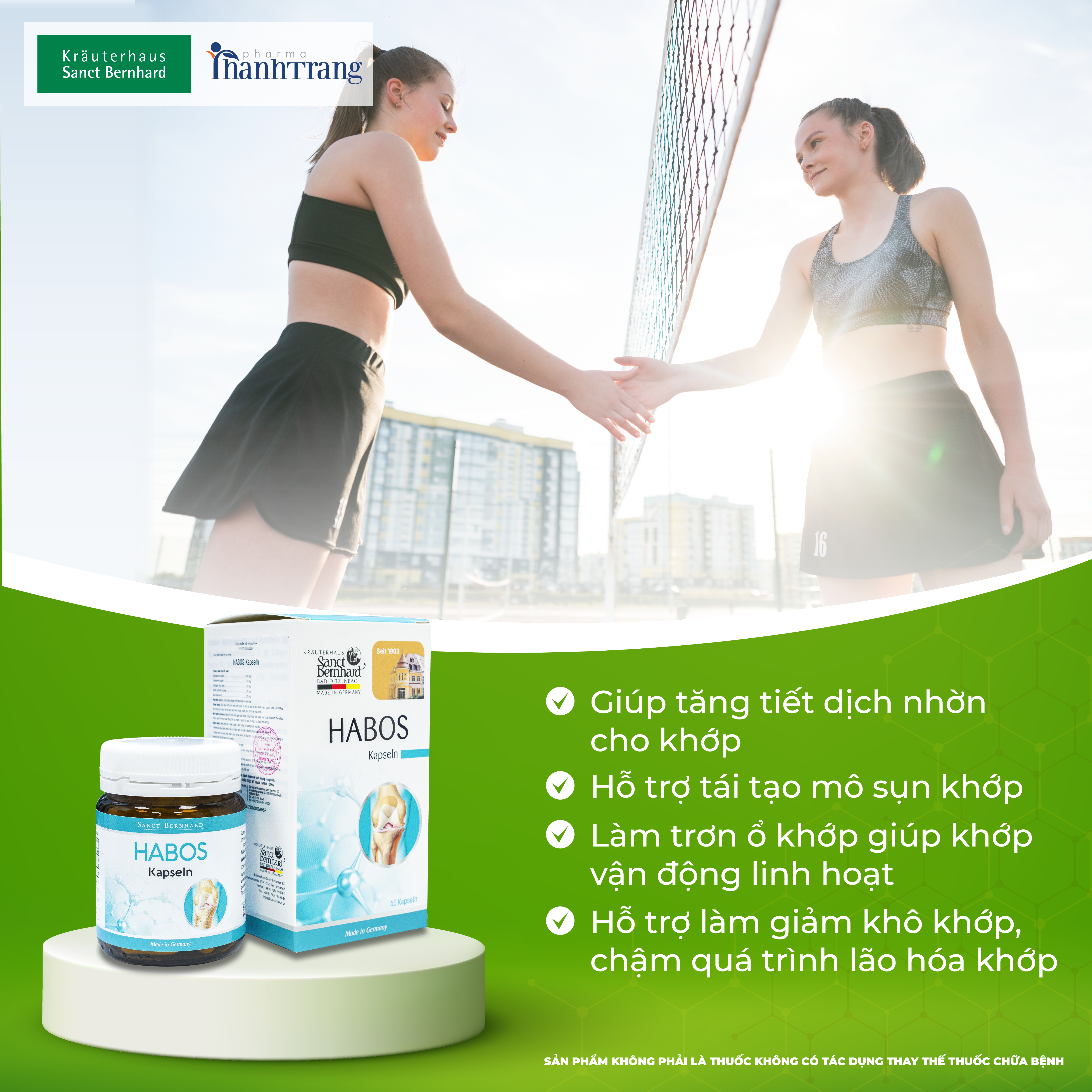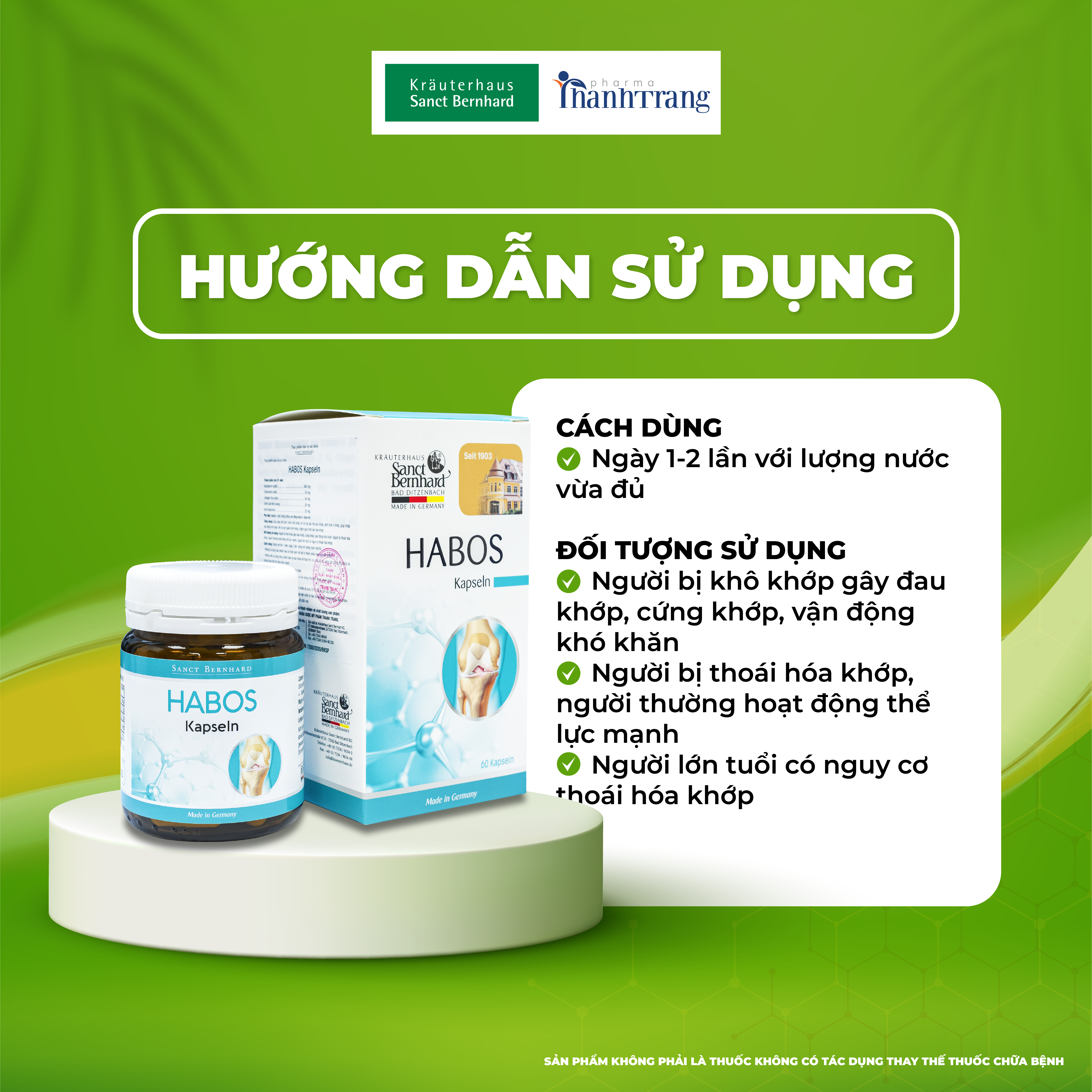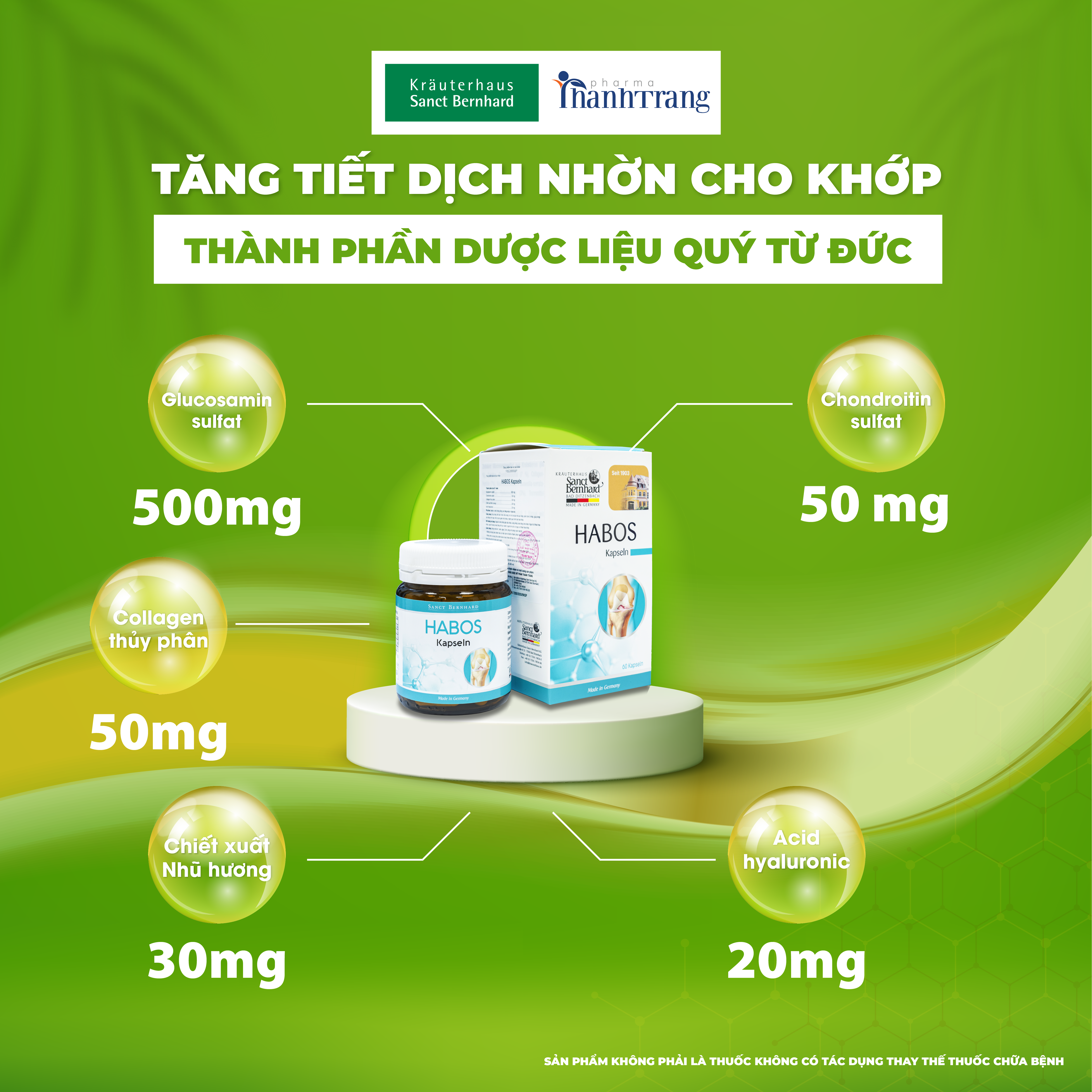 HABOS KAPSELN - Viên uống tăng cường sức mạnh xương khớp. Giúp cung cấp dưỡng chất cho khớp, nuôi dưỡng mô sụn và tăng sản xuất dịch nhầy cho hoạt dịch. Hỗ trợ phòng ngừa các bệnh về xương khớp, giúp giảm các triệu chứng thoái hóa khớp, thoát vị đĩa đệm, đau khớp, khô khớp và đau khớp. Hỗ trợ phục hồi các khớp bị tổn thương.