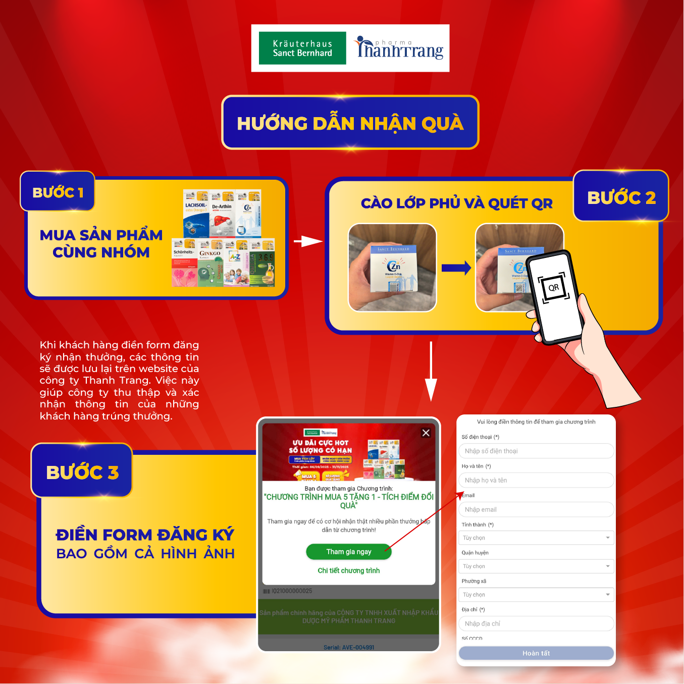 Bước 1: Mua sản phẩm cùng nhóm thuộc thương hiệu Sanct Bernhard( Các nhà thuốc, quầy thuốc trên toàn quốc ) đối tác của Thanh Trang Pharma trên Toàn Quốc.