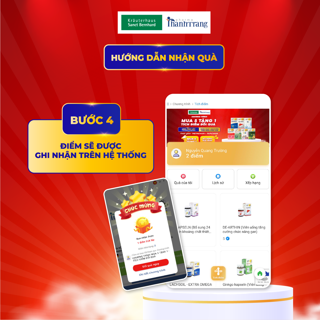 Khi khách hàng mua 05 sản phẩm chính hãng trong nhóm 07 sản phẩm Sanct Bernhard tại tại điểm bán hàng chính hãng ( Các nhà thuốc, quầy thuốc trên toàn quốc ) đối tác của Thanh Trang Pharma dưới đây trong thời gian áp dụng chương trình khuyến mại từ 06/09/2025 đến 31/12/2025 sẽ được TẶNG NGAY 01 sản phẩm cụ thể: