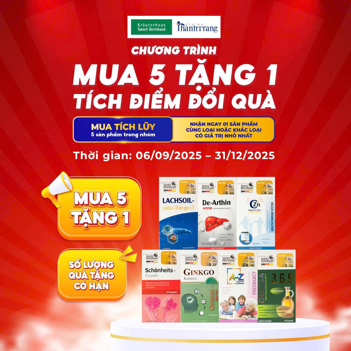 Khách hàng mua 05 sản phẩm chính hãng trong nhóm 07 sản phẩm Sanct Bernhard tại điểm bán hàng chính hãng (Các nhà thuốc, quầy thuốc trên toàn quốc) đối tác của Thanh Trang Pharma trong thời gian áp dụng chương trình khuyến mại từ 06/09/2025 đến 30/12/2025 dưới đây sẽ được TẶNG NGAY 01 sản phẩm cụ thể: