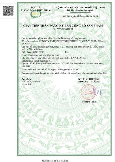 Viên uống bổ sung sắt Eisen Kapseln được nghiên cứu và sản xuất bởi thương hiệu Sanct Bernhard (CHLB Đức) – thương hiệu có lịch sử hơn 120 năm uy tín trong lĩnh vực chăm sóc sức khỏe và thực phẩm bổ sung từ thiên nhiên, đạt chuẩn chất lượng châu Âu và phân phối độc quyền bởi Dược Phẩm Thanh Trang.